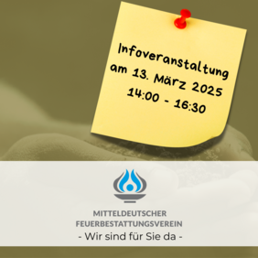 Der Mitteldeutsche Feuerbestattungsverein lädt Sie herzlich zu einer Infoveranstaltung am Donnerstag, den 13. März 2025 von 14:00 bis ca. 16:30 Uhr ein.